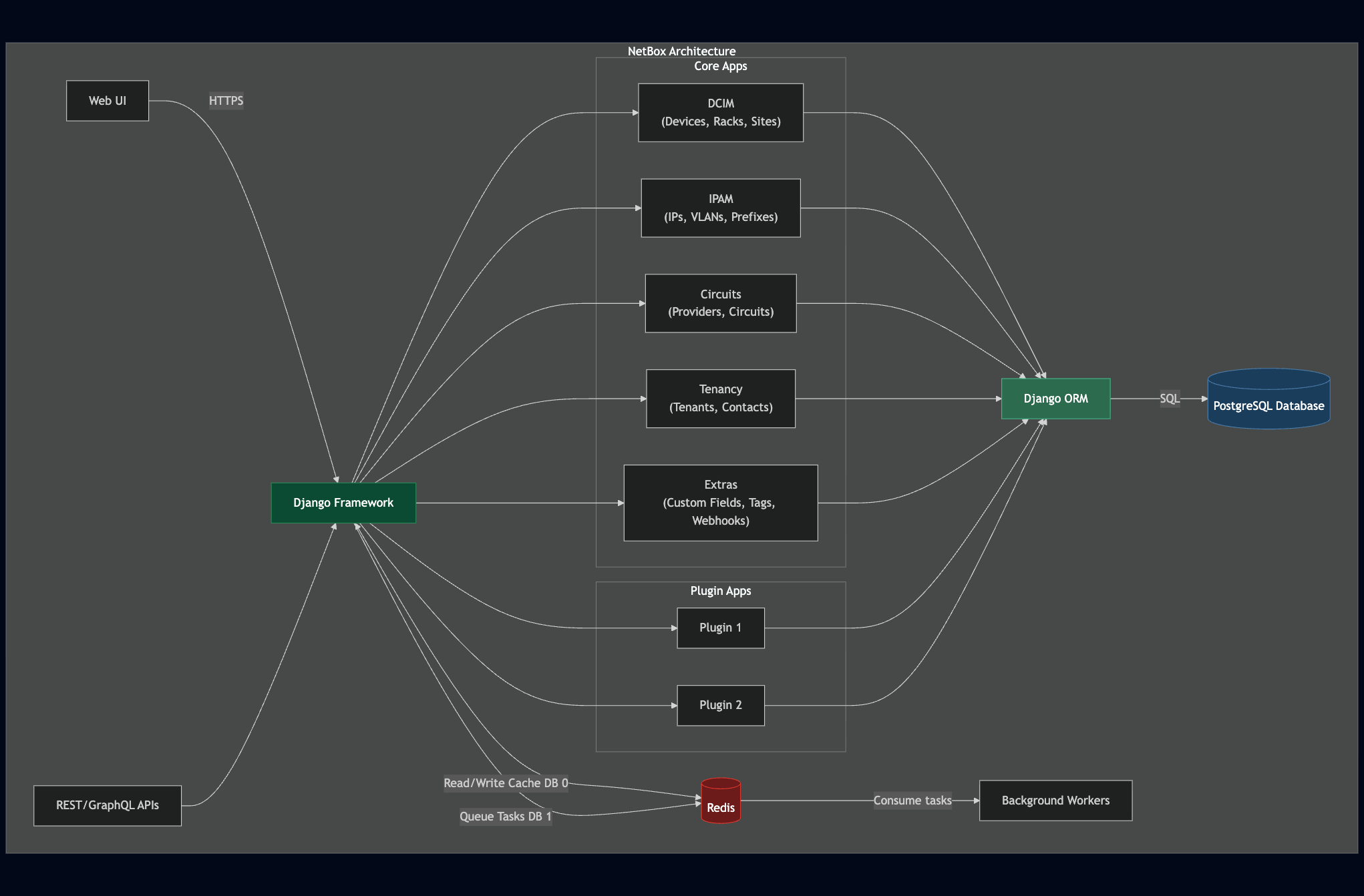 NetBox is built in Python using Django, with Django ORM handling interactions with its PostgreSQL database. Redis serves dual purposes: caching (for performance) and task queuing (for background jobs like webhook deliveries, report generation, and custom script execution). These use separate Redis databases within the same instance, with background tasks processed asynchronously by workers. For caching, Django checks Redis before querying PostgreSQL, significantly improving performance for repeated queries.