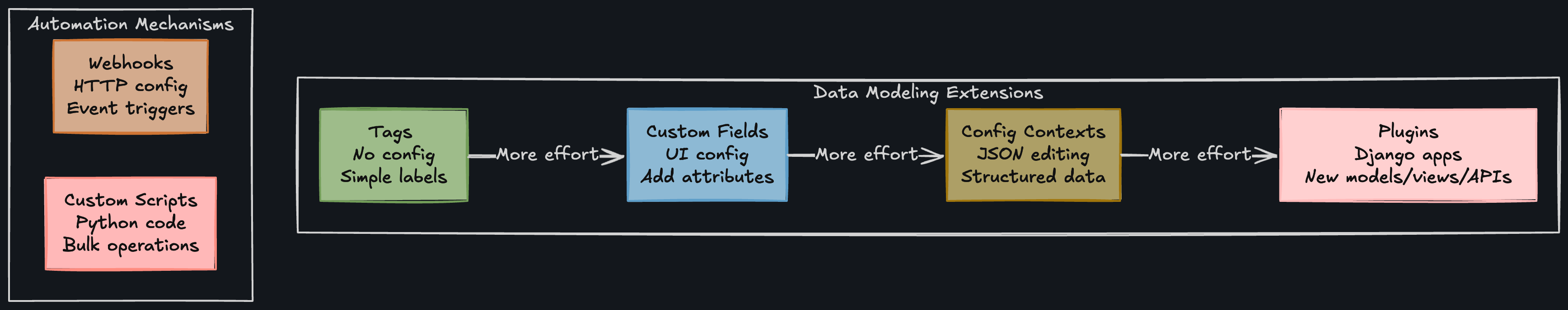NetBox’s architecture supports extensions by design. The developers know their base data model, whilst comprehensive, won’t cover every business case. I’ve found it helpful to think about the six extension mechanisms in two categories.